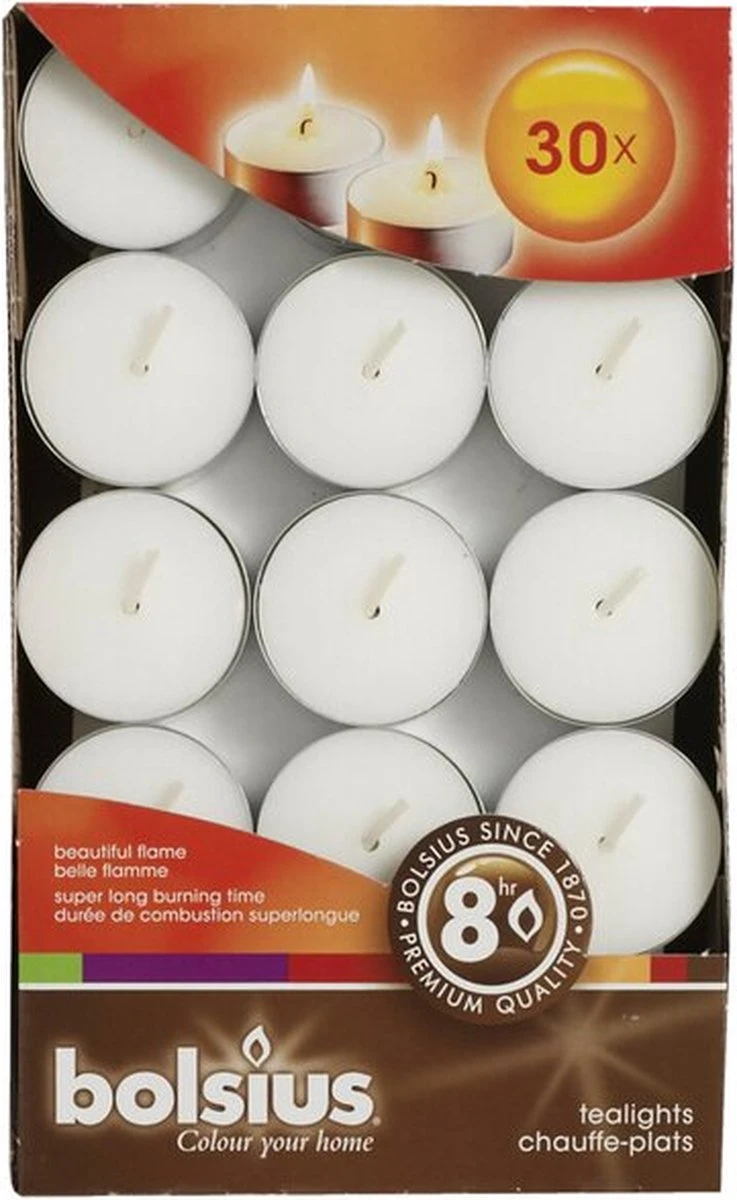 Bolsius theelichten box 30 8 uur wit. Wilt u wat sfeer creëren? Warentuin heeft de mooiste kaarsen in alle vormen, kleuren en geuren! Van het merk Bolsius U bestelt 4 stuks ‘Bolsius theelichten