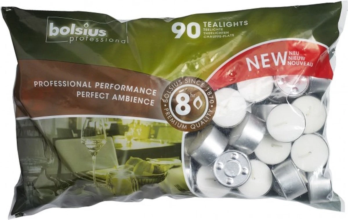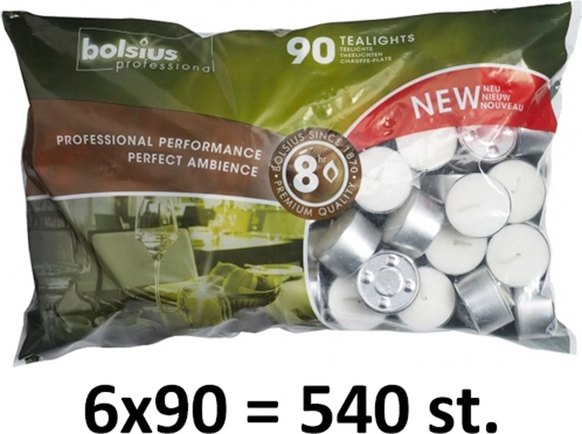 540 stuks 8 uurs Bolsius professional theelichtjes / waxinelichtjes in de kleur wit met zilverkleurige aluminium cups als voordeelverpakking. Verpakt handig in 6 zakken met 90 stuks in iedere zak. Een theelichtje is altijd handig om bij de hand te hebben want je weet nooit wie er langs komt, wat de avond brengt of in welke sfeer mood u zich in bevindt. Hoeveelheid: 540 stuks warm aanbevolen sfeer-waxines in handige bewaar doos aangeleverd en per waxine 8 branduren. Bestel aantal 1 = 540 stuks