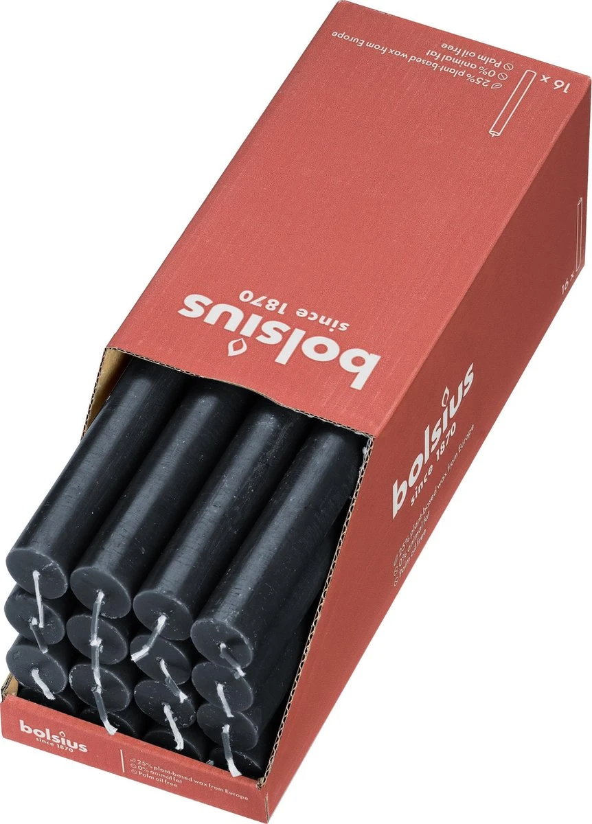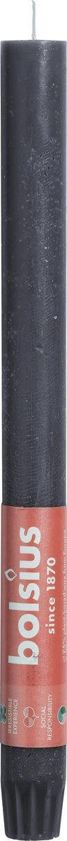 Maak van elk moment een bijzonder moment! Met het natuurlijke licht van kaarsen zorg je voor warmte en sfeer in huis en maak je het gezellig. De Bolsius rustieke dinerkaarsen in de donkergrijze kleur Stormy Grey zijn 27cm hoog, druipen niet en branden wel 13 uur. Gemaakt met liefde voor mens en planeet, zonder palmolie en met natuurlijke vegan wax. Door het katoenen lontje altijd een perfecte vlam, zonder zwarte aanslag of walm.