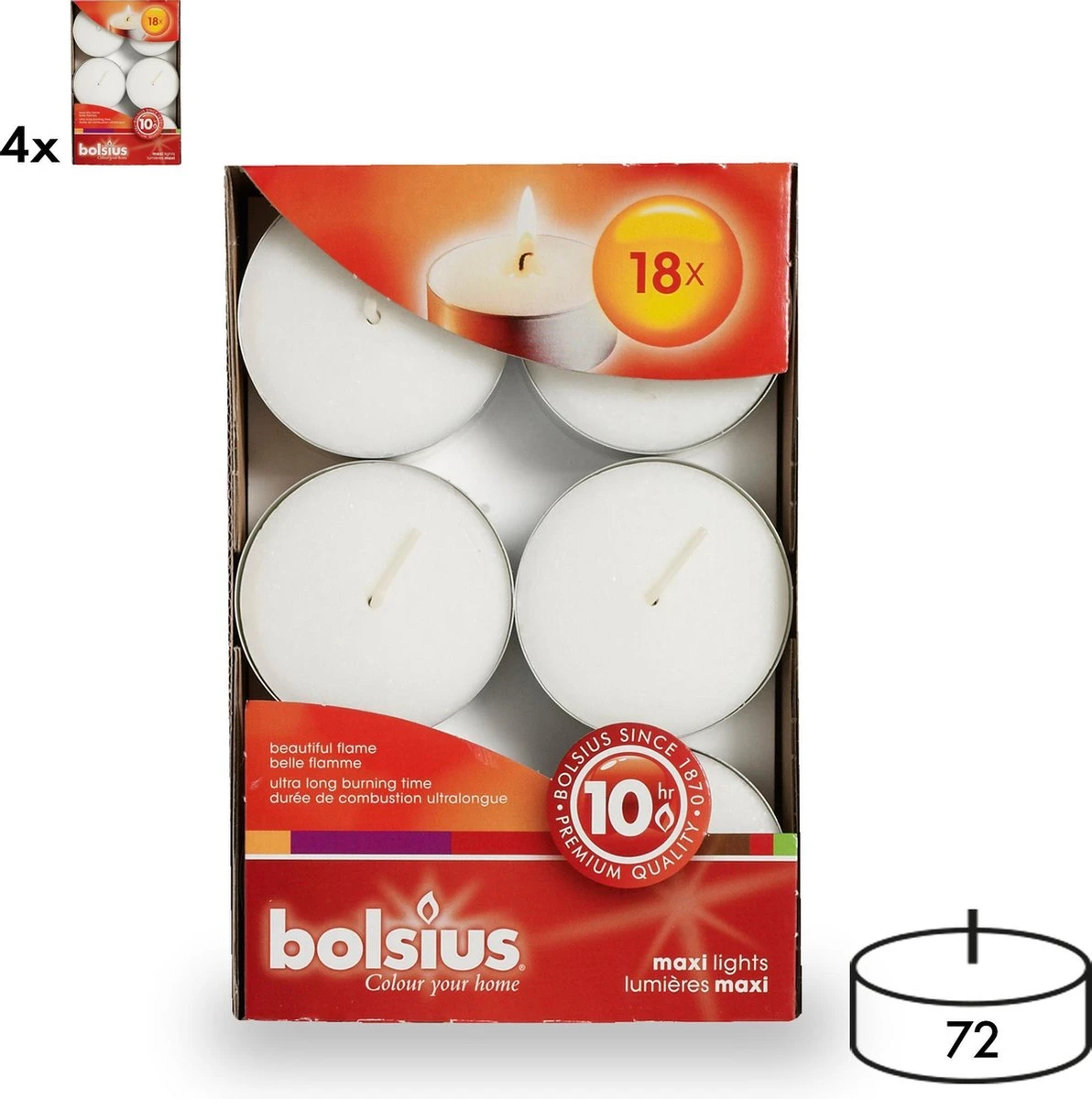 Met waxinelichtjes haal je gezelligheid in huis! Deze Bolsius maxi theelichten in 4 dozen van 18 stuks hebben een extra lange brandduur, tot wel 10 uur. Elke Bolsius kaars is gemaakt met vakmanschap en met oog voor kwaliteit. Hierdoor roeten de waxinelichtjes niet en ontstaat er geen walm of rook wanneer je ze brandt. Het katoenen lontje, ook wel kaarsenpit genoemd, is zo gevlochten dat je altijd een stabiele vlam hebt. De theelichtjes zijn niet alleen functioneel maar geven ook sfeer als je ze in een leuke waxinelichthouder zet. Geniet van de magie van natuurlijk licht.