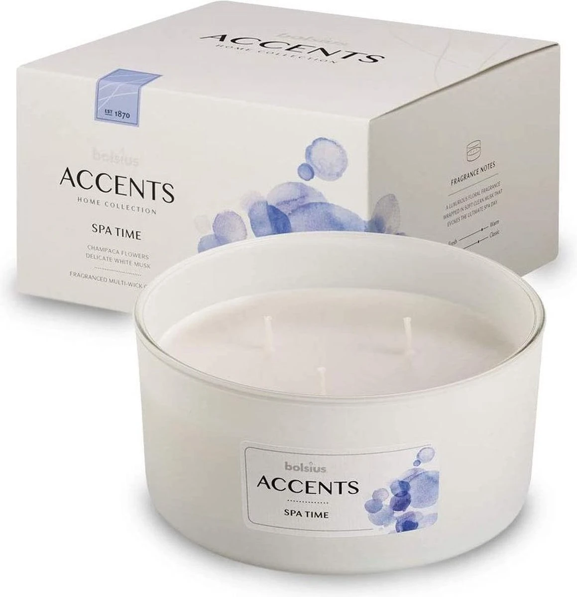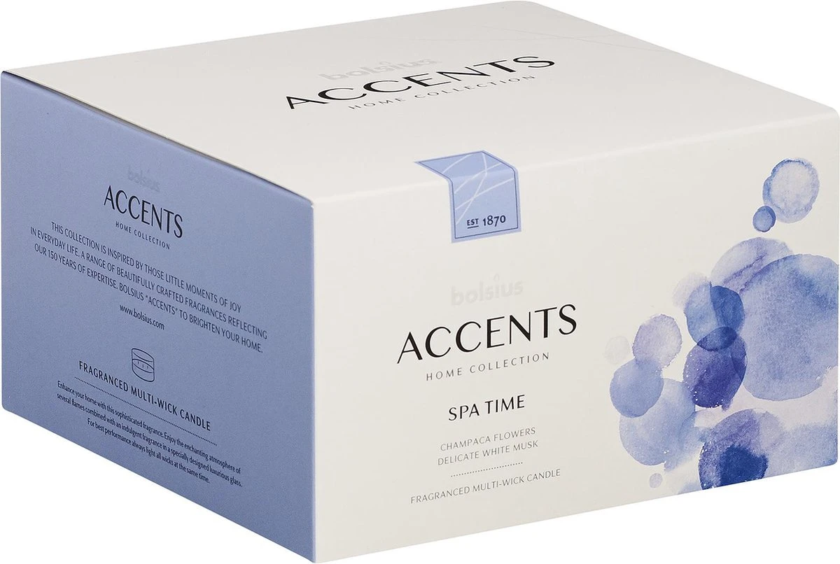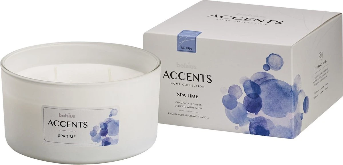 De Spa Time geur uit de Bolsius Accents lijn heeft de zachte geur van magnolia champaca bloemen en delicate witte musk. Met deze geur tover jij je badkamer om tot een thuis spa waar je heerlijk van wat ‘’me-time’’ kunt genieten.