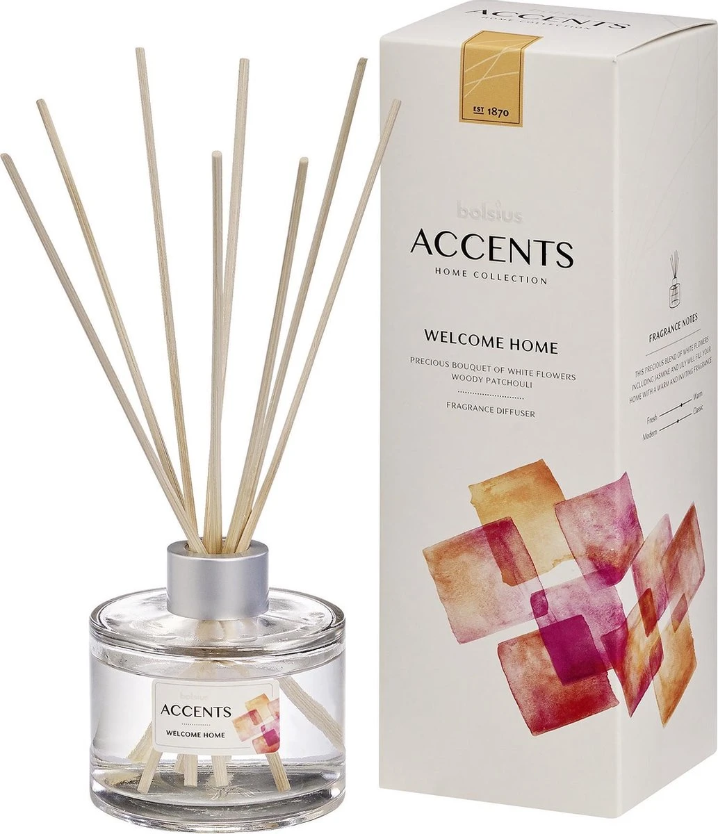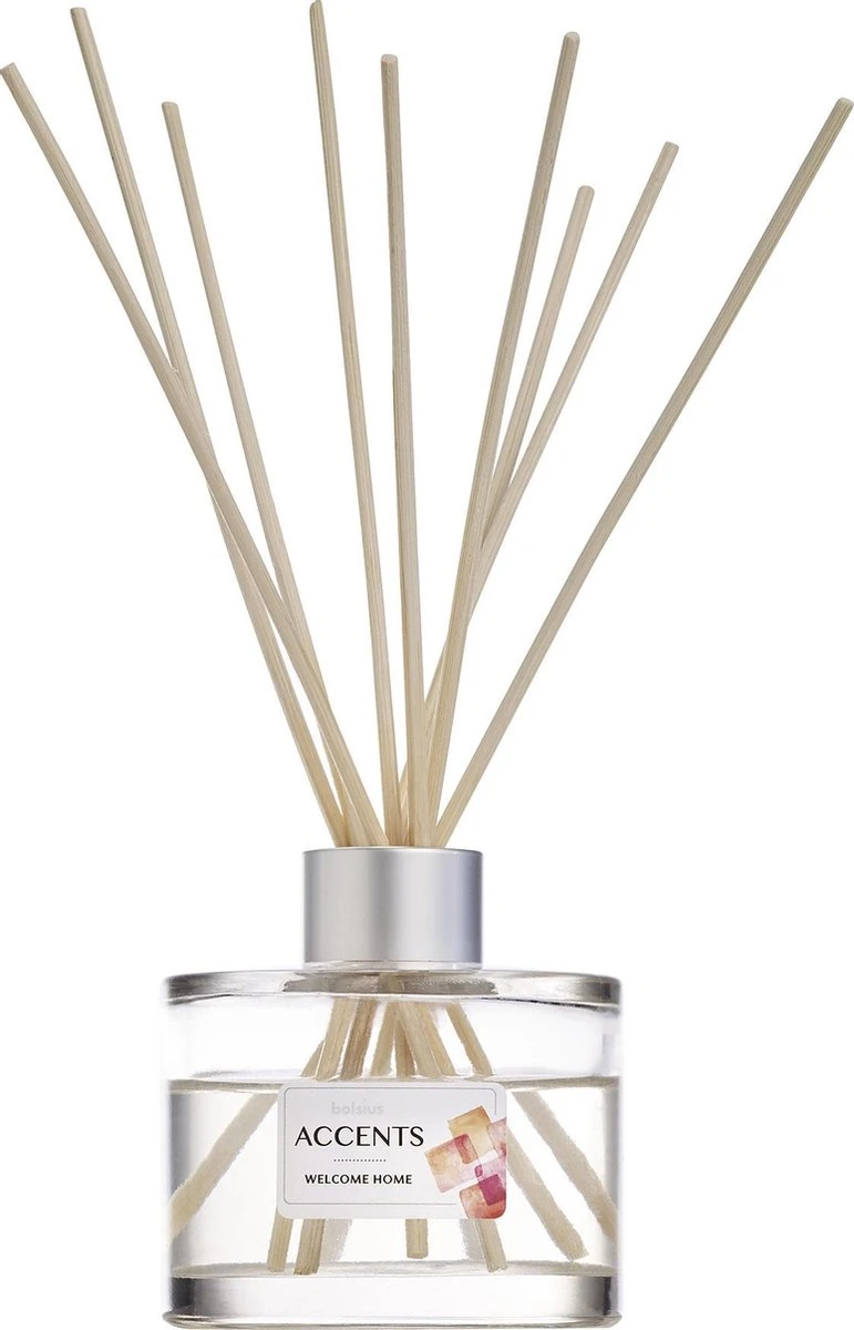 Geniet tot wel 8 weken lang van de heerlijke geur van witte bloemen, houten vloeren en patchoeli met deze Bolsius Accents Geurstokjes in de geur Welcome Home. Geuren die je thuis laten komen. De geurstokjes hebben een inhoud van 100ml waardoor ze tot wel 8 weken geuren. Door de mooie strakke vormgeving passen de geurstokjes in ieder interieur.