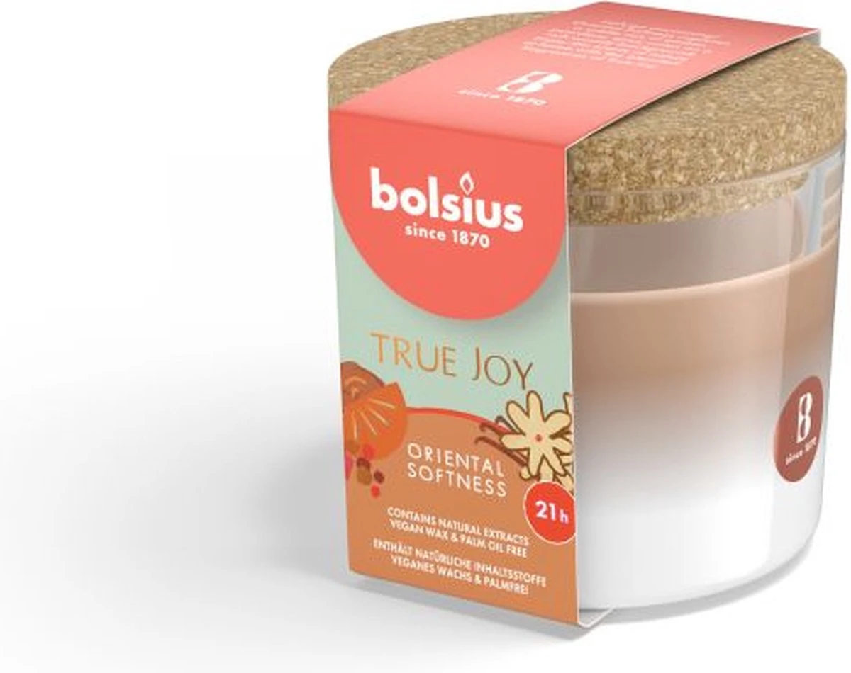 Met deze geurkaars van Bolsius verspreid je een heerlijk natuurlijke geur door je huis. Voor deze geur zijn alleen natuurlijke extracten gebruikt en geen palmolie. Hij is echt gemaakt met liefde voor mens en planeet. Deze True Joy geur is geïnspireerd door verleidelijke aardse geuren uit de natuur. De geur van oriental softness is een mix van mos, zwoele houttonen met een vleugje sinaasappel en poederige amber. Ontdek de kalmerende geur van een oosterse tuin in volle bloei met deze geurkaars.
