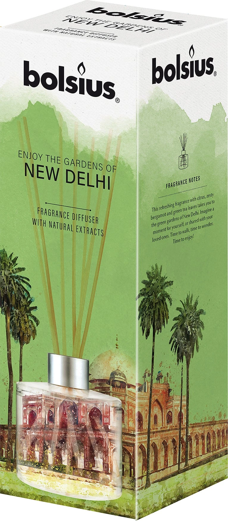 Deze verfrissende geur met citrus, heerlijke bergamot en groene theebladeren neemt je mee naar de tuinen van New Delhi. Stel je een relaxed moment voor jezelf of met je geliefden voor. Tijd om te wandelen, tijd om je te verwonderen. Tijd om te genieten!