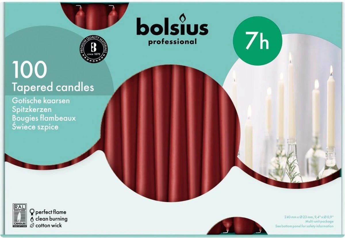 100 stuks wijnrood-kleurige spits toelopende Bolsius gotische dinerkaarsen 240/23 als voordeel verpakking. Deze wijnrode kaarsen walmen nauwelijks en hebben ook een zeer beperkte kans op druipen. De gotische kaarsen zijn verkrijgbaar in verschillende klassieke kleuren. De wijnrood Bolsius kaarsen hebben een slanke, gladde voet, waardoor ze makkelijk pas te maken zijn en geschikt zijn voor verschillende houders. De lont is van katoen en zorgt voor perfect rustige brandeigenschappen. Brandduur 7 uur. Kleur wijnrood. Merk Bolsius met de lengte 240 mm en diameter 23 mm. De perfecte chique kaars op de gedekte tafel. Bestel aantal 1 = 100 stuks