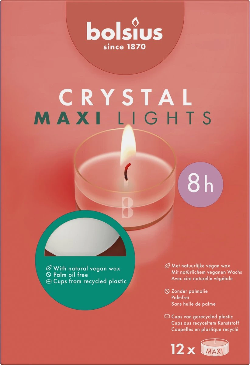 Met waxinelichtjes haal je gezelligheid in huis! Deze Bolsius maxi theelichten met doorzichtige cup in 6 dozen van 12 stuks hebben een lange brandduur, tot wel 8 uur. Gemaakt met vakmanschap én liefde voor mens en planeet. Zonder palmolie en met natuurlijke vegan wax. Met de theelichtjes voeg je niet alleen extra sfeer en warmte toe aan je interieur, maar geef je je tafel of dressoir een extra touch door ze te combineren in verschillende waxinelichthouders. Geniet van de magie van natuurlijk licht.