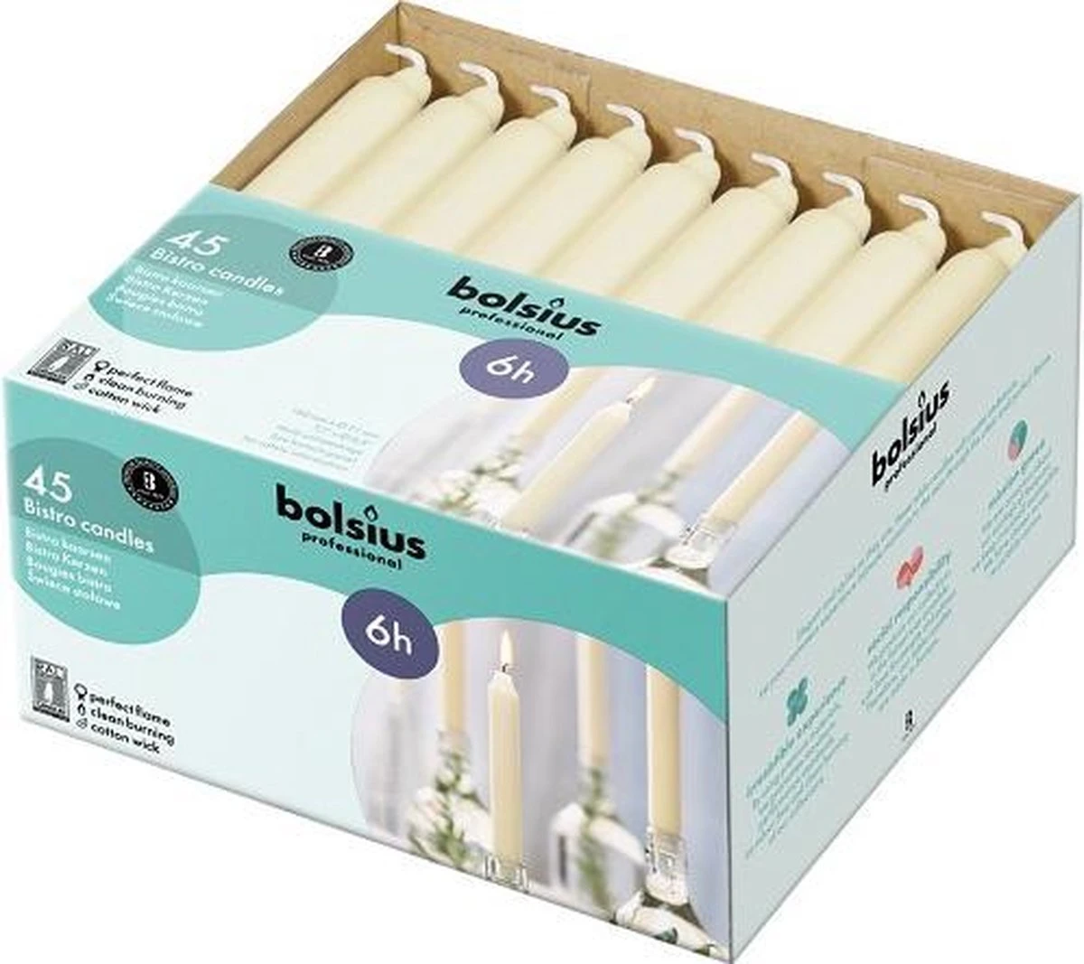Deze ivoorkleurige, lange kaarsen van Bolsius zorgen voor weinig roetvorming en zijn druipvrij. Deze professionele dinerkaarsen zijn sfeerverhogend en ideaal voor ’s avonds op tafel in uw huis of restaurant. Oftewel, de professionele performance in combinatie met de perfecte ambiance.