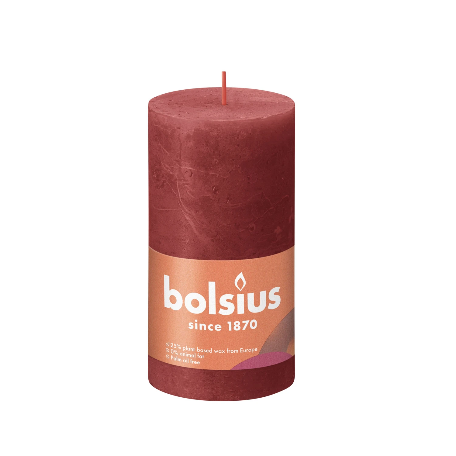 Bolsius weet hoe jij sfeer in huis haalt! Hun kaarsen brengen al meer dan een eeuw sfeer in huizen door heel Europa. Deze rustieke Bolsius stompkaars in de kleur rood is 13 cm hoog, met een diameter van 6,8 cm. Daarmee heeft hij tot wel 60 branduren! Deze kaars kan bovendien op elk moment gebruikt worden: ’s avonds op de bank, buiten in de tuin, of tijdens het diner!