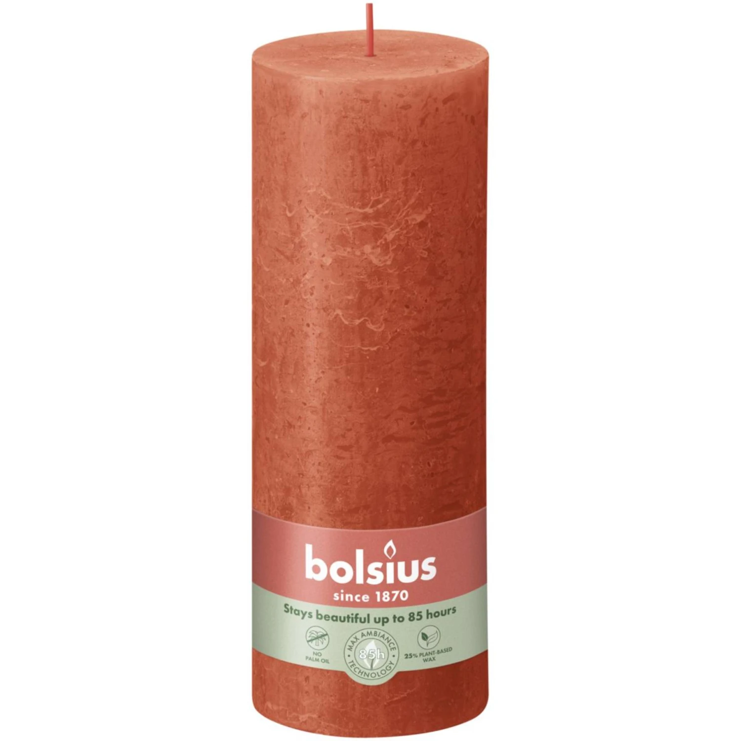 Deze klassieke rustieke Bolsius kaars in de kleur Aards Oranje heeft een afmeting van 19 x 6,8 cm. De kaars zorgt voor een gezellige en warme sfeer in de woonkamer tijdens een avondje bankhangen of een ontspannende sfeer in de badkamer tijdens het badderen. De kaars brand na ca. 65 uren op en roet niet. Combineer de kaars met andere kleuren of formaten van kaarsen en plaats ze op een plateau voor een mooi effect.