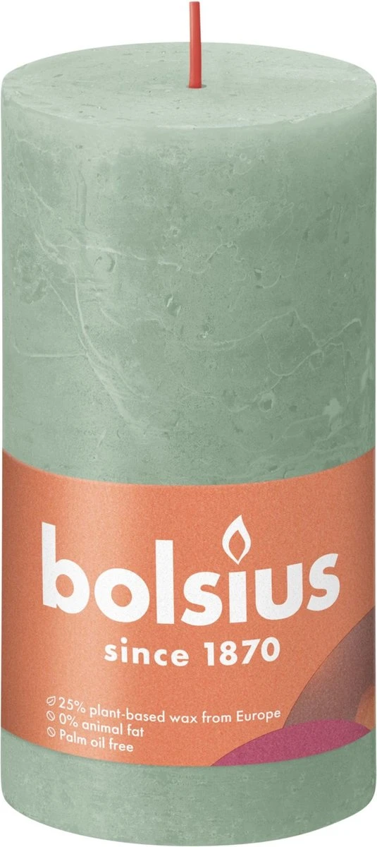 Deze Bolsius Rustieke Kaars in de kleur Sage Green is gemaakt met liefde voor mens en planeet. Dus zonder palmolie en dierlijk vet maar met plantaardige wax. De kaars bestaat voor 25% uit plantaardige wax afkomstig uit Europa.