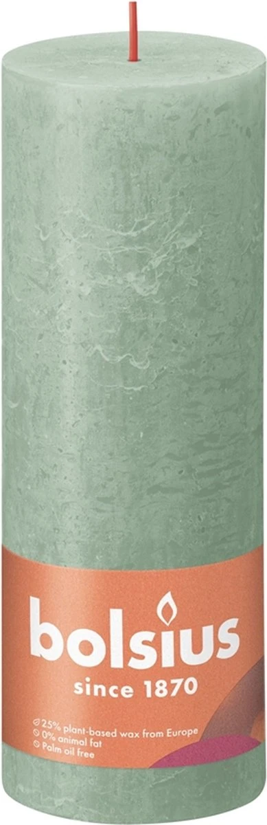 Deze Bolsius Rustieke Kaars in de kleur Sage Green is gemaakt met liefde voor mens en planeet. Dus zonder palmolie en dierlijk vet maar met plantaardige wax. De kaars bestaat voor 25% uit plantaardige wax afkomstig uit Europa.