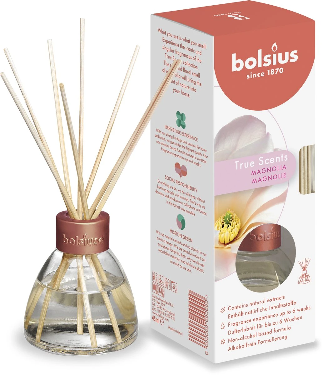 Bolsius gebruikt natuurlijke extracten en alleen de beste grondstoffen. De samenstelling bevat geen alcohol. De geur verspreidt zich langzaam door de ruimte en blijft tot wel 6 weken hangen. Alle geuren zijn ontwikkeld in samenwerking met geurspecialisten voor de allerbeste geurbeleving.